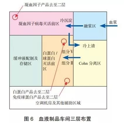 布置中,不僅將血液制品的病毒滅活前后工藝生產區單獨設置,并且將病毒滅活工藝前工藝區與病毒滅活后工藝區分別整合在上下兩個樓層里面。首先從區域管理上,2個區域更加地相互獨立,人員與物流管理上更加簡單。其次,每個產品的病毒滅活前后工藝生產區域上下基本一一對應,未完全病毒滅活后產品分裝區與凝血因子病毒滅活后區上下對應,完全病毒滅活后產品分裝區與完全病毒滅活后產品原液區上下對應。
